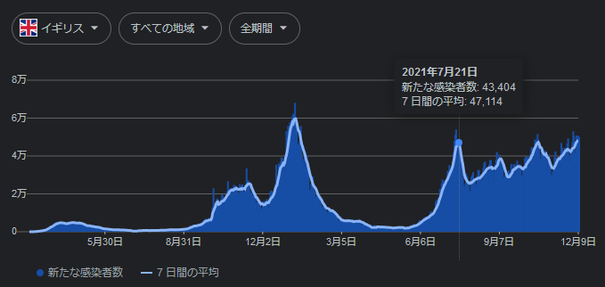 以下のグラフより、前回のイギリスのピークを43404人(7日間平均)とすると、オミクロンの感染数ピークは2.38億人(感染可能期間10日推計)または404万人(感染可能期間19日推計)と推計されます。