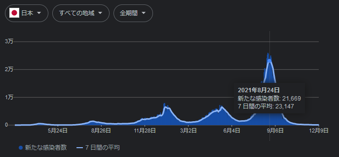以下のグラフより、前回のピークを23147人(7日間平均)とすると、オミクロンの感染数ピークは1.27億人(感染可能期間10日推計)または215万人(感染可能期間19日推計)と推計されます。